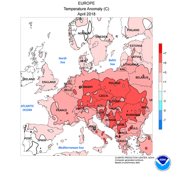 En illustration : carte NOAA des écarts à la température moyenne. Toute l’Europe centrale a connu un mois d’avril historiquement chaud avec des excédents compris entre +5 et +7°. La France, située en marge, a été concernée dans une moindre mesure ; chez nous, les références resteront les mois d’avril 2007 et 2011, celui de cette année arrivant en 3ème position. En moins de 15 ans, ce sont donc 3 mois d’avril exceptionnels qui ont été observés. Auparavant, ces données étaient beaucoup plus espacées et rares (avril 1865, 1893 ou 1949).